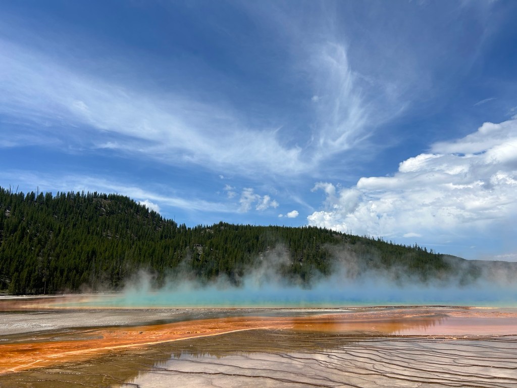 We stopped at a few smaller geysers along the way to Grand Prismatic Springs. It was absolutely beautiful. The colors of the water were so vibrant and the steam rolling off the top was just as colorful!