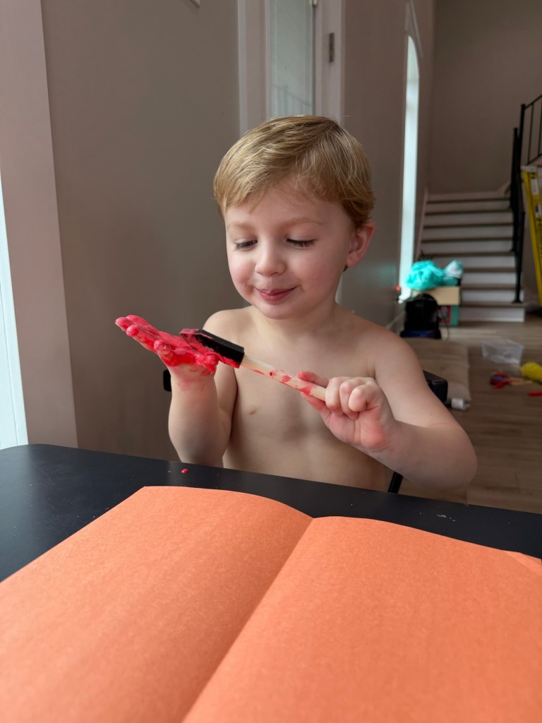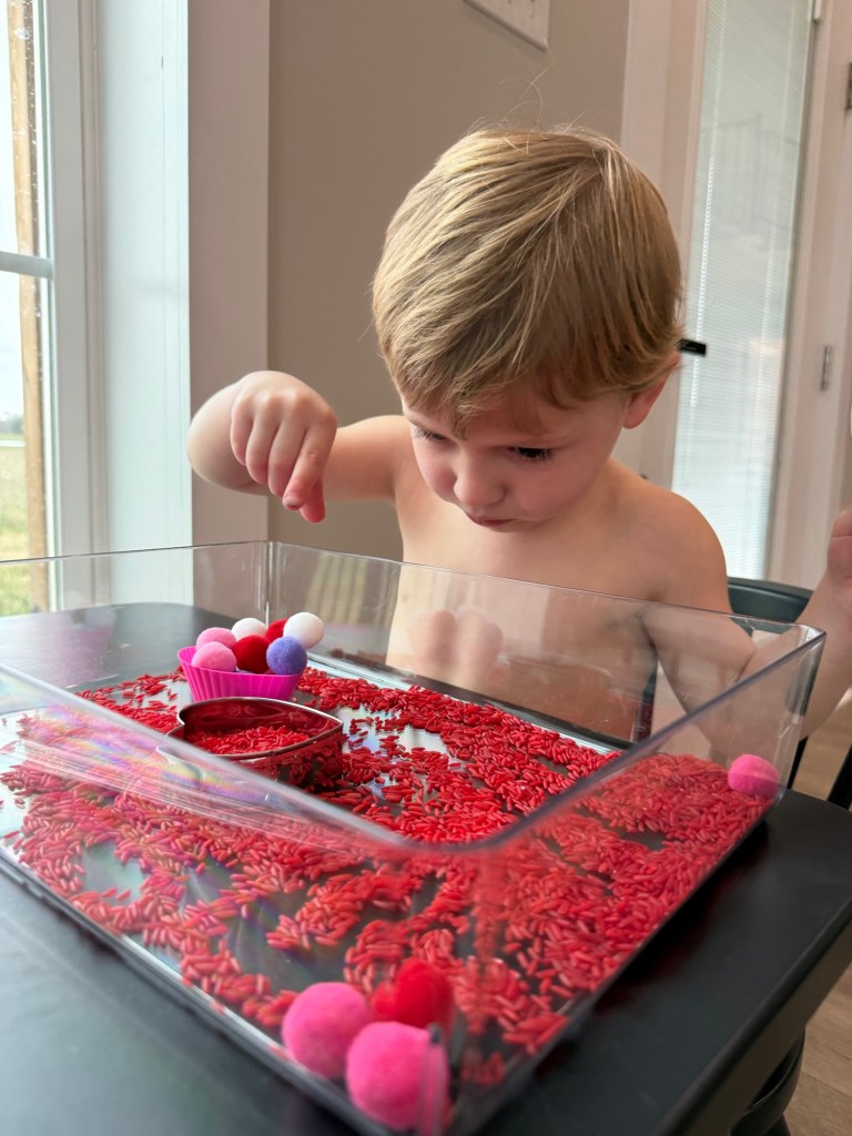 We made Valentine’s Day cards for everyone and played in our Valentine’s Day themed sensory box from our Learning with Kelsey school subscription.