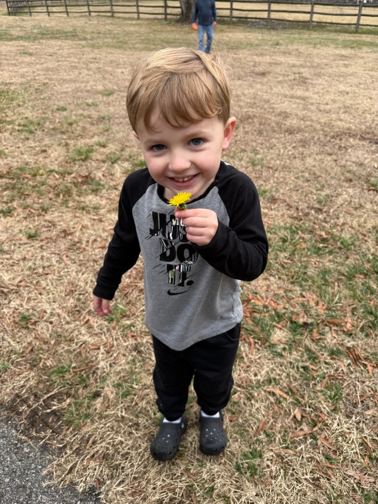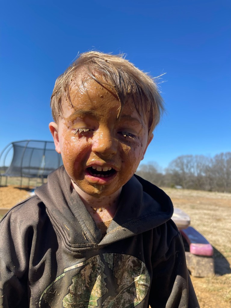 The weather was finally warm enough to get outside a little bit, and it had rained so there were lots of muddy puddles!! Kobe cannonballed into those muddy puddles until he slipped and face planted.